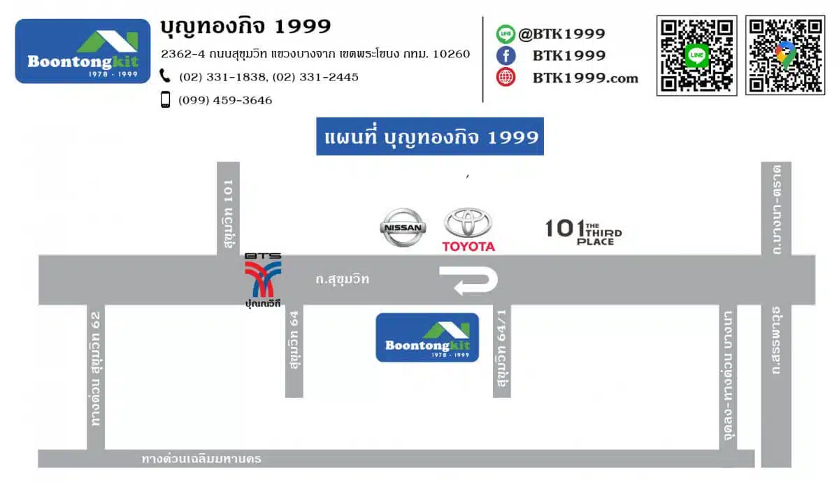 รถยนต์ส่วนตัว: บุญทองกิจ 1999 จะอยู่ติดถนนสุขุมวิทฝั่งเข้าเมือง ตั้งอยู่ระหว่างซอยสุขุมวิท 64 กับซอยสุขุมวิท 64/1 ตรงข้ามโชว์รูมรถ NISSAN