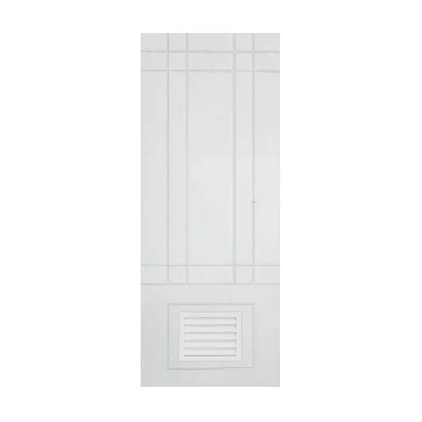 • ประตู uPVC ภายใน Polywood กระจกฝ้าบน-เกล็ดล่าง เซาะร่อง Vacuum ตั้ง 1 เส้น, นอน 1 เส้น PSW-26 สีขาว ผิวลายเสี้ยนไม้